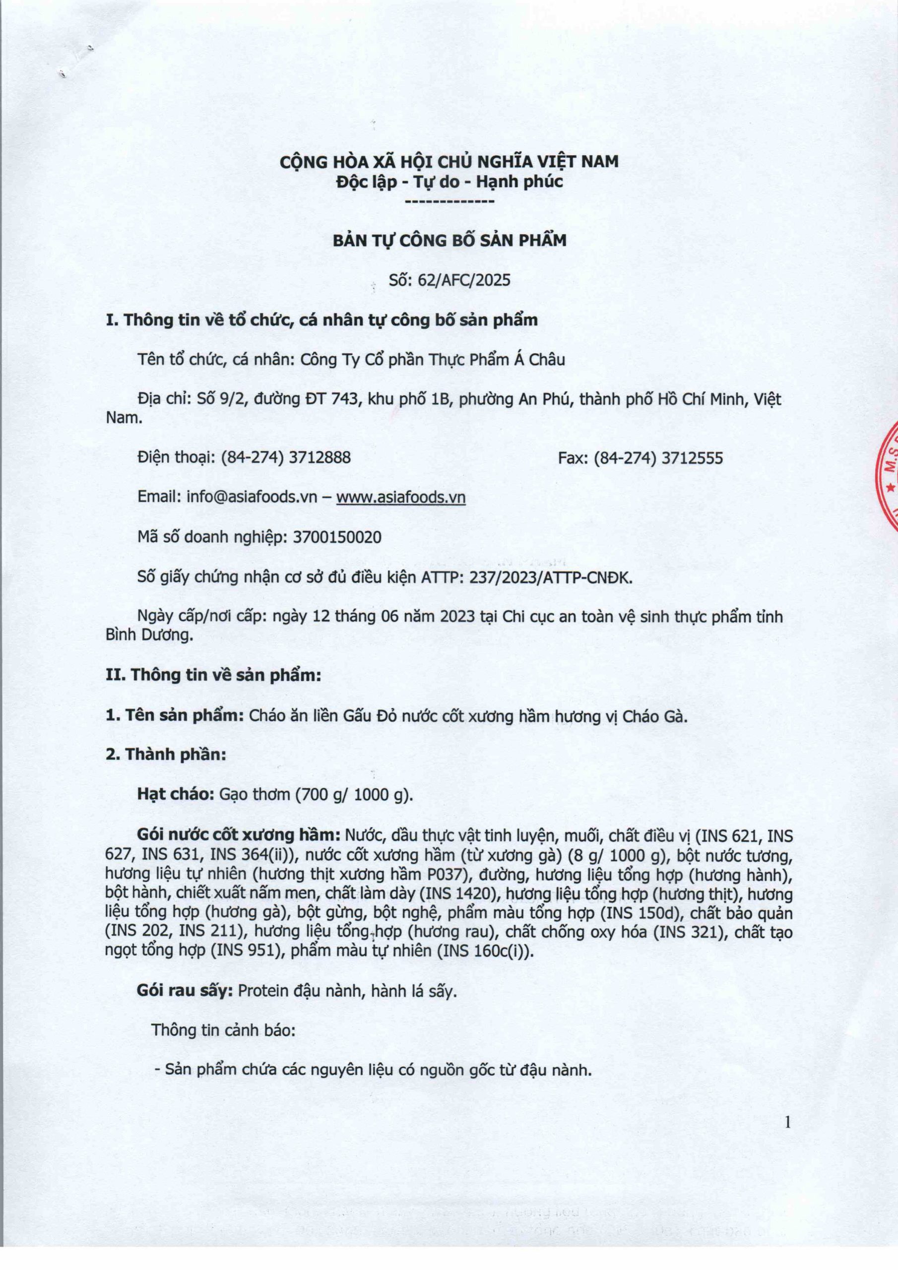 62AFC2025-CHÁO ĂN LIỀN GẤU ĐỎ NƯỚC CỐT XƯƠNG HẦM HƯƠNG VỊ CHÁO GÀ_Số 62.2025
